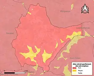 Le retrait-gonflement des sols argileux est susceptible d'engendrer des dommages importants aux bâtiments en cas d’alternance de périodes de sécheresse et de pluie[21]. La totalité de la commune est en aléa moyen ou fort (91,8 % au niveau départemental et 48,5 % au niveau national)[Carte 2]. Depuis le , en application de la loi ELAN, différentes contraintes s'imposent aux vendeurs, maîtres d'ouvrages ou constructeurs de biens situés dans une zone classée en aléa moyen ou fort[Note 2],[22].