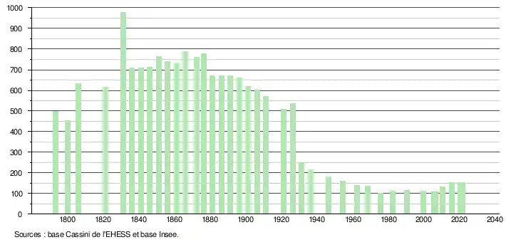 L'évolution du nombre d'habitants est connue à travers les recensements de la population effectués dans la commune depuis 1793. Pour les communes de moins de 10 000 habitants, une enquête de recensement portant sur toute la population est réalisée tous les cinq ans, les populations légales des années intermédiaires étant quant à elles estimées par interpolation ou extrapolation[37]. Pour la commune, le premier recensement exhaustif entrant dans le cadre du nouveau dispositif a été réalisé en 2005[38].