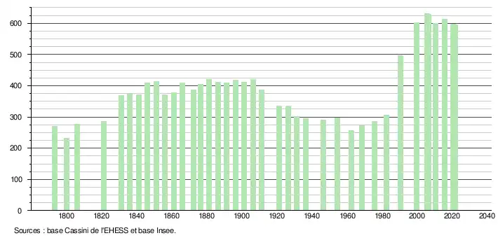 L'évolution du nombre d'habitants est connue à travers les recensements de la population effectués dans la commune depuis 1793. Pour les communes de moins de 10 000 habitants, une enquête de recensement portant sur toute la population est réalisée tous les cinq ans, les populations légales des années intermédiaires étant quant à elles estimées par interpolation ou extrapolation[26]. Pour la commune, le premier recensement exhaustif entrant dans le cadre du nouveau dispositif a été réalisé en 2005[27].
