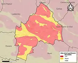 Le retrait-gonflement des sols argileux est susceptible d'engendrer des dommages importants aux bâtiments en cas d’alternance de périodes de sécheresse et de pluie. La totalité de la commune est en aléa moyen ou fort (75,2 % au niveau départemental et 48,5 % au niveau national). Sur les 581 bâtiments dénombrés sur la commune en 2019, 581 sont en aléa moyen ou fort, soit 100 %, à comparer aux 94 % au niveau départemental et 54 % au niveau national. Une cartographie de l'exposition du territoire national au retrait gonflement des sols argileux est disponible sur le site du BRGM[24],[Carte 3].