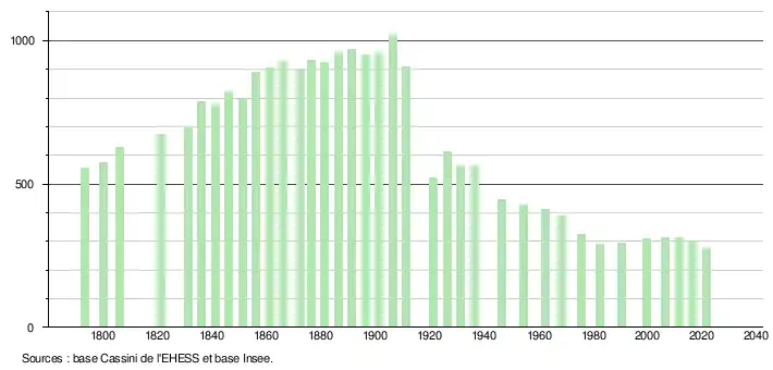 L'évolution du nombre d'habitants est connue à travers les recensements de la population effectués dans la commune depuis 1793. Pour les communes de moins de 10 000 habitants, une enquête de recensement portant sur toute la population est réalisée tous les cinq ans, les populations légales des années intermédiaires étant quant à elles estimées par interpolation ou extrapolation[26]. Pour la commune, le premier recensement exhaustif entrant dans le cadre du nouveau dispositif a été réalisé en 2006[27].