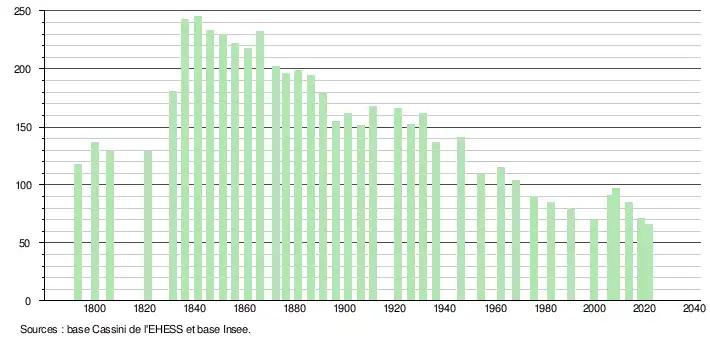 L'évolution du nombre d'habitants est connue à travers les recensements de la population effectués dans la commune depuis 1793. Pour les communes de moins de 10 000 habitants, une enquête de recensement portant sur toute la population est réalisée tous les cinq ans, les populations légales des années intermédiaires étant quant à elles estimées par interpolation ou extrapolation[20]. Pour la commune, le premier recensement exhaustif entrant dans le cadre du nouveau dispositif a été réalisé en 2008[21].