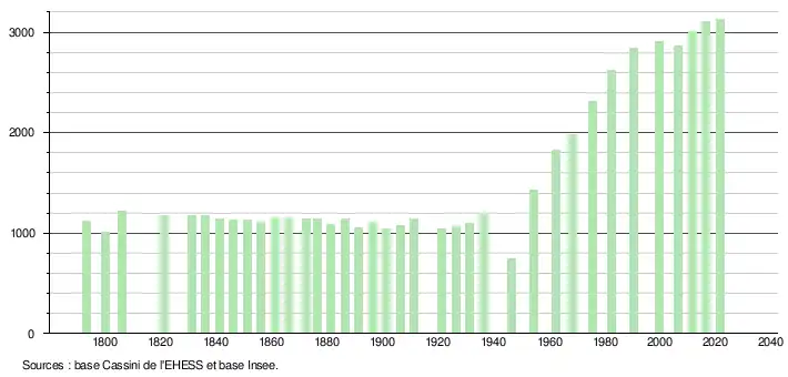 L'évolution du nombre d'habitants est connue à travers les recensements de la population effectués dans la commune depuis 1793. Pour les communes de moins de 10 000 habitants, une enquête de recensement portant sur toute la population est réalisée tous les cinq ans, les populations légales des années intermédiaires étant quant à elles estimées par interpolation ou extrapolation[33]. Pour la commune, le premier recensement exhaustif entrant dans le cadre du nouveau dispositif a été réalisé en 2006[34].
