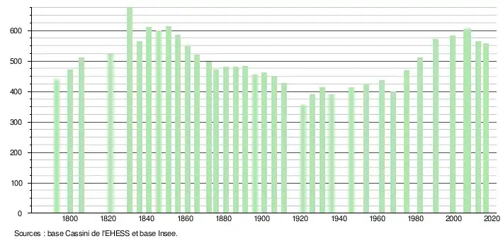 L'évolution du nombre d'habitants est connue à travers les recensements de la population effectués dans la commune depuis 1793. Pour les communes de moins de 10 000 habitants, une enquête de recensement portant sur toute la population est réalisée tous les cinq ans, les populations légales des années intermédiaires étant quant à elles estimées par interpolation ou extrapolation[24]. Pour la commune, le premier recensement exhaustif entrant dans le cadre du nouveau dispositif a été réalisé en 2007[25].