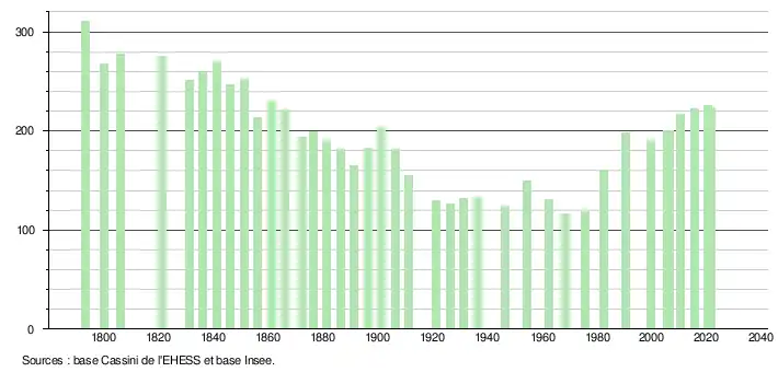 L'évolution du nombre d'habitants est connue à travers les recensements de la population effectués dans la commune depuis 1793. Pour les communes de moins de 10 000 habitants, une enquête de recensement portant sur toute la population est réalisée tous les cinq ans, les populations légales des années intermédiaires étant quant à elles estimées par interpolation ou extrapolation[16]. Pour la commune, le premier recensement exhaustif entrant dans le cadre du nouveau dispositif a été réalisé en 2005[17].