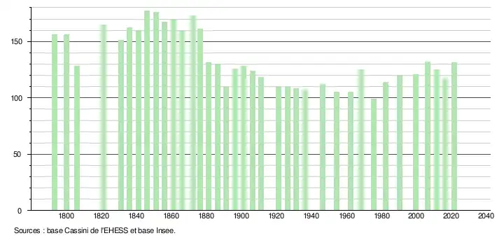 L'évolution du nombre d'habitants est connue à travers les recensements de la population effectués dans la commune depuis 1793. Pour les communes de moins de 10 000 habitants, une enquête de recensement portant sur toute la population est réalisée tous les cinq ans, les populations légales des années intermédiaires étant quant à elles estimées par interpolation ou extrapolation[28]. Pour la commune, le premier recensement exhaustif entrant dans le cadre du nouveau dispositif a été réalisé en 2006[29].