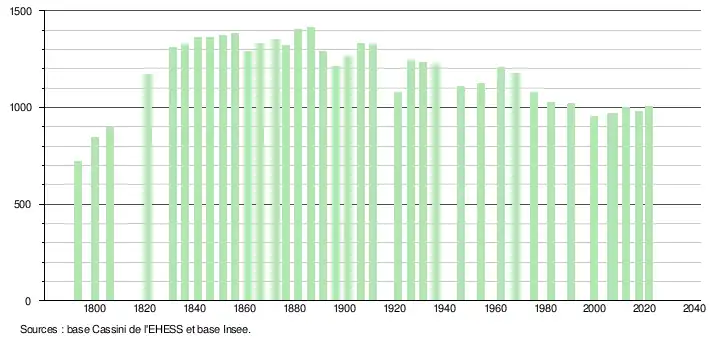 L'évolution du nombre d'habitants est connue à travers les recensements de la population effectués dans la commune depuis 1793. Pour les communes de moins de 10 000 habitants, une enquête de recensement portant sur toute la population est réalisée tous les cinq ans, les populations légales des années intermédiaires étant quant à elles estimées par interpolation ou extrapolation[24]. Pour la commune, le premier recensement exhaustif entrant dans le cadre du nouveau dispositif a été réalisé en 2007[25].