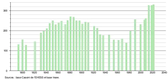 L'évolution du nombre d'habitants est connue à travers les recensements de la population effectués dans la commune depuis 1793. Pour les communes de moins de 10 000 habitants, une enquête de recensement portant sur toute la population est réalisée tous les cinq ans, les populations légales des années intermédiaires étant quant à elles estimées par interpolation ou extrapolation[17]. Pour la commune, le premier recensement exhaustif entrant dans le cadre du nouveau dispositif a été réalisé en 2008[18].