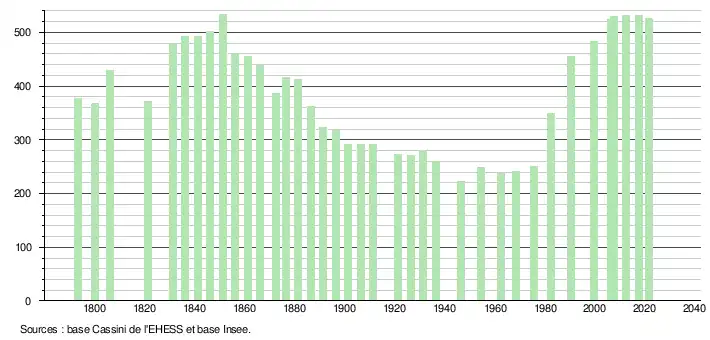 L'évolution du nombre d'habitants est connue à travers les recensements de la population effectués dans la commune depuis 1793. Pour les communes de moins de 10 000 habitants, une enquête de recensement portant sur toute la population est réalisée tous les cinq ans, les populations légales des années intermédiaires étant quant à elles estimées par interpolation ou extrapolation[18]. Pour la commune, le premier recensement exhaustif entrant dans le cadre du nouveau dispositif a été réalisé en 2007[19].