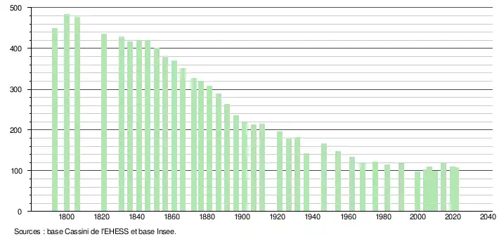 L'évolution du nombre d'habitants est connue à travers les recensements de la population effectués dans la commune depuis 1793. Pour les communes de moins de 10 000 habitants, une enquête de recensement portant sur toute la population est réalisée tous les cinq ans, les populations légales des années intermédiaires étant quant à elles estimées par interpolation ou extrapolation[18]. Pour la commune, le premier recensement exhaustif entrant dans le cadre du nouveau dispositif a été réalisé en 2004[19].