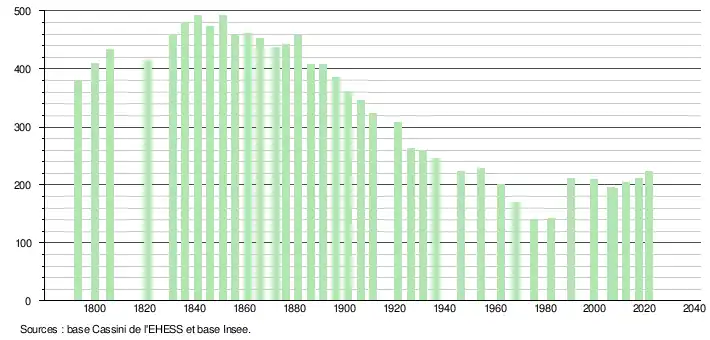 L'évolution du nombre d'habitants est connue à travers les recensements de la population effectués dans la commune depuis 1793. Pour les communes de moins de 10 000 habitants, une enquête de recensement portant sur toute la population est réalisée tous les cinq ans, les populations légales des années intermédiaires étant quant à elles estimées par interpolation ou extrapolation[18]. Pour la commune, le premier recensement exhaustif entrant dans le cadre du nouveau dispositif a été réalisé en 2007[19].