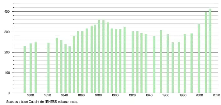 L'évolution du nombre d'habitants est connue à travers les recensements de la population effectués dans la commune depuis 1793. À partir du , les populations légales des communes sont publiées annuellement dans le cadre d'un recensement qui repose désormais sur une collecte d'information annuelle, concernant successivement tous les territoires communaux au cours d'une période de cinq ans. Pour les communes de moins de 10 000 habitants, une enquête de recensement portant sur toute la population est réalisée tous les cinq ans, les populations légales des années intermédiaires étant quant à elles estimées par interpolation ou extrapolation[12]. Pour la commune, le premier recensement exhaustif entrant dans le cadre du nouveau dispositif a été réalisé en 2007[13],[Note 1].
