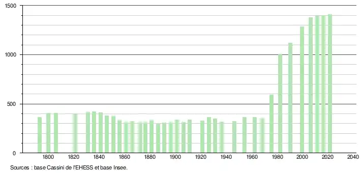 L'évolution du nombre d'habitants est connue à travers les recensements de la population effectués dans la commune depuis 1793. Pour les communes de moins de 10 000 habitants, une enquête de recensement portant sur toute la population est réalisée tous les cinq ans, les populations légales des années intermédiaires étant quant à elles estimées par interpolation ou extrapolation[17]. Pour la commune, le premier recensement exhaustif entrant dans le cadre du nouveau dispositif a été réalisé en 2006[18].