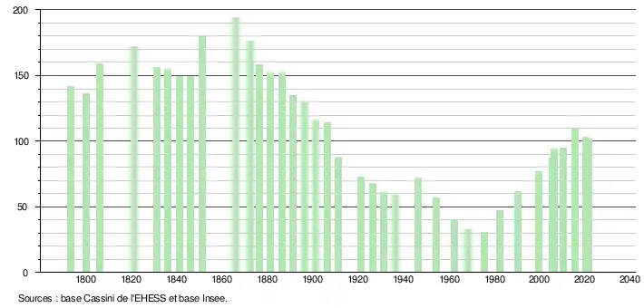 L'évolution du nombre d'habitants est connue à travers les recensements de la population effectués dans la commune depuis 1793. Pour les communes de moins de 10 000 habitants, une enquête de recensement portant sur toute la population est réalisée tous les cinq ans, les populations légales des années intermédiaires étant quant à elles estimées par interpolation ou extrapolation[16]. Pour la commune, le premier recensement exhaustif entrant dans le cadre du nouveau dispositif a été réalisé en 2005[17].