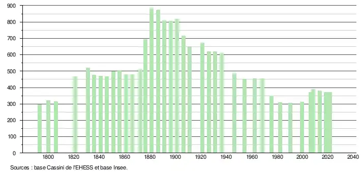 | L'évolution du nombre d'habitants est connue à travers les recensements de la population effectués dans la commune depuis 1793. Pour les communes de moins de 10 000 habitants, une enquête de recensement portant sur toute la population est réalisée tous les cinq ans, les populations légales des années intermédiaires étant quant à elles estimées par interpolation ou extrapolation[33]. Pour la commune, le premier recensement exhaustif entrant dans le cadre du nouveau dispositif a été réalisé en 2008[34]. En 2021, la commune comptait 371 habitants[Note 6], en diminution de 2,88 % par rapport à 2015 (Aude : +2,47 %, France hors Mayotte : +1,84 %). |