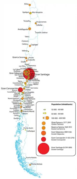 (de) Cet article est partiellement ou en totalité issu de l’article de Wikipédia en allemand intitulé « Liste der Städte in Chile » (voir la liste des auteurs).
