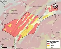 Le retrait-gonflement des sols argileux est susceptible d'engendrer des dommages importants aux bâtiments en cas d’alternance de périodes de sécheresse et de pluie. 71,5 % de la superficie communale est en aléa moyen ou fort (59,3 % au niveau départemental et 48,5 % au niveau national). Sur les 138 bâtiments dénombrés sur la commune en 2019, 105 sont en aléa moyen ou fort, soit 76 %, à comparer aux 85 % au niveau départemental et 54 % au niveau national. Une cartographie de l'exposition du territoire national au retrait gonflement des sols argileux est disponible sur le site du BRGM[22],[Carte 2].