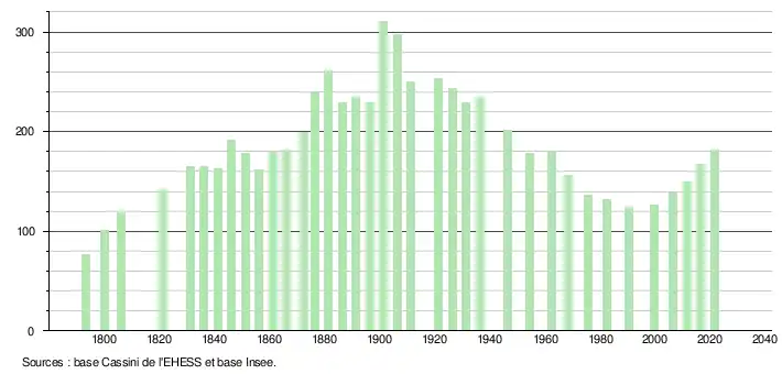 L'évolution du nombre d'habitants est connue à travers les recensements de la population effectués dans la commune depuis 1793. Pour les communes de moins de 10 000 habitants, une enquête de recensement portant sur toute la population est réalisée tous les cinq ans, les populations légales des années intermédiaires étant quant à elles estimées par interpolation ou extrapolation[24]. Pour la commune, le premier recensement exhaustif entrant dans le cadre du nouveau dispositif a été réalisé en 2006[25].