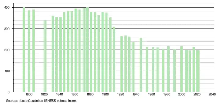 L'évolution du nombre d'habitants est connue à travers les recensements de la population effectués dans la commune depuis 1793. Pour les communes de moins de 10 000 habitants, une enquête de recensement portant sur toute la population est réalisée tous les cinq ans, les populations légales des années intermédiaires étant quant à elles estimées par interpolation ou extrapolation[17]. Pour la commune, le premier recensement exhaustif entrant dans le cadre du nouveau dispositif a été réalisé en 2005[18].