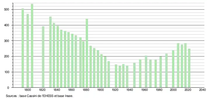 - Population municipale légale en vigueur au 1er janvier 2024, millésimée 2021, définie dans les limites territoriales en vigueur au 1er janvier 2023, date de référence statistique : 1er janvier 2021.