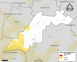 Le retrait-gonflement des sols argileux est susceptible d'engendrer des dommages importants aux bâtiments en cas d’alternance de périodes de sécheresse et de pluie. 22,2 % de la superficie communale est en aléa moyen ou fort (52,8 % au niveau départemental et 48,5 % au niveau national). Sur les 121 bâtiments dénombrés sur la commune en 2019, 49 sont en aléa moyen ou fort, soit 40 %, à comparer aux 70 % au niveau départemental et 54 % au niveau national. Une cartographie de l'exposition du territoire national au retrait gonflement des sols argileux est disponible sur le site du BRGM[18],[Carte 2].