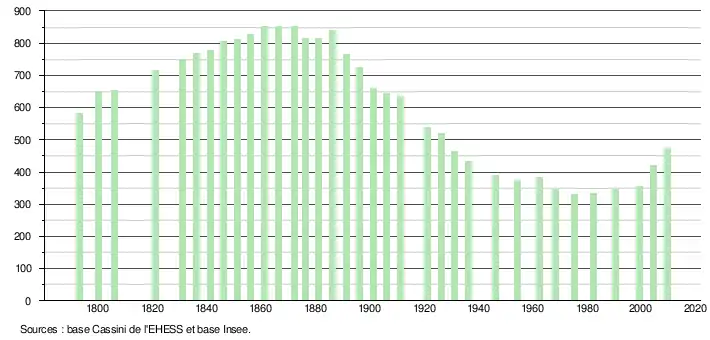 L'évolution du nombre d'habitants est connue à travers les recensements de la population effectués dans la commune depuis 1793. À partir du , les populations légales des communes sont publiées annuellement dans le cadre d'un recensement qui repose désormais sur une collecte d'information annuelle, concernant successivement tous les territoires communaux au cours d'une période de cinq ans. Pour les communes de moins de 10 000 habitants, une enquête de recensement portant sur toute la population est réalisée tous les cinq ans, les populations légales des années intermédiaires étant quant à elles estimées par interpolation ou extrapolation[4]. Pour la commune, le premier recensement exhaustif entrant dans le cadre du nouveau dispositif a été réalisé en 2004[5],[Note 1].
