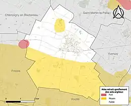 Les mouvements de terrains susceptibles de se produire sur la commune sont des tassements différentiels[20]. Le retrait-gonflement des sols argileux est susceptible d'engendrer des dommages importants aux bâtiments en cas d’alternance de périodes de sécheresse et de pluie[21]. 52,2 % de la superficie communale est en aléa moyen ou fort (79,5 % au niveau départemental et 48,5 % au niveau national)[Carte 2]. Depuis le , en application de la loi ÉLAN, différentes contraintes s'imposent aux vendeurs, maîtres d'ouvrages ou constructeurs de biens situés dans une zone classée en aléa moyen ou fort[Note 3],[22].