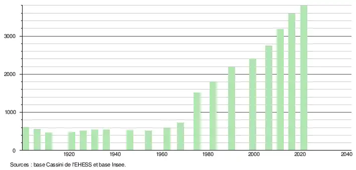 L'évolution du nombre d'habitants est connue à travers les recensements de la population effectués dans la commune depuis 1901. Pour les communes de moins de 10 000 habitants, une enquête de recensement portant sur toute la population est réalisée tous les cinq ans, les populations légales des années intermédiaires étant quant à elles estimées par interpolation ou extrapolation[19]. Pour la commune, le premier recensement exhaustif entrant dans le cadre du nouveau dispositif a été réalisé en 2006[20].