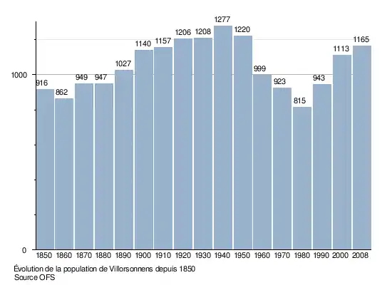 Le graphique suivant résume l'évolution de la population de Villorsonnens (et communes fusionnées ultérieurement) entre 1850 et 2008[3] :