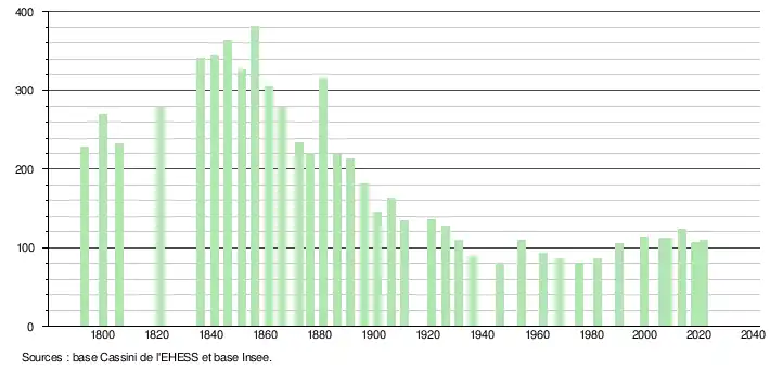 L'évolution du nombre d'habitants est connue à travers les recensements de la population effectués dans la commune depuis 1793. Pour les communes de moins de 10 000 habitants, une enquête de recensement portant sur toute la population est réalisée tous les cinq ans, les populations légales des années intermédiaires étant quant à elles estimées par interpolation ou extrapolation[14]. Pour la commune, le premier recensement exhaustif entrant dans le cadre du nouveau dispositif a été réalisé en 2008[15].