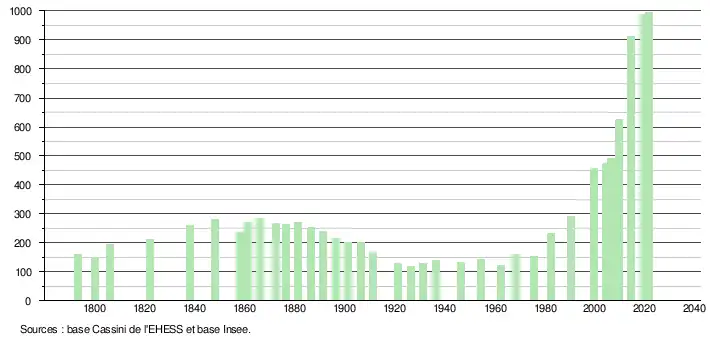 L'évolution du nombre d'habitants est connue à travers les recensements de la population effectués dans la commune depuis 1793. Pour les communes de moins de 10 000 habitants, une enquête de recensement portant sur toute la population est réalisée tous les cinq ans, les populations légales des années intermédiaires étant quant à elles estimées par interpolation ou extrapolation[15]. Pour la commune, le premier recensement exhaustif entrant dans le cadre du nouveau dispositif a été réalisé en 2004[16].