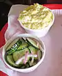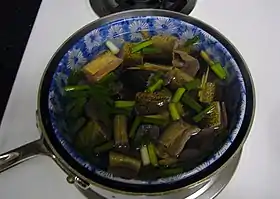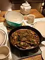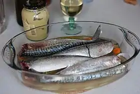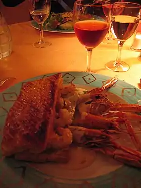 | Sète | Soupe de poissons à la sétoise[46] | Poissons cuisinés avec légumes, vin et huile d'olive | Entrée ou plat principal | Vin blanc | Picpoul de Pinet | Cuisine languedocienne | |