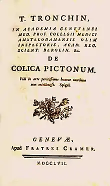 Il fallut pourtant attendre 1473 pour dénoncer les dangers du « chaulage du vin ». Ce fut Nicolas Ellembourg, moine de l'abbaye bénédictine d'Ottobeuren qui fit cette relation[35]. Puis au siècle suivant, Jacques Auguste de Thou décrivit pour la première fois les symptômes de l'empoisonnement : « Dès qu'un homme est attaqué, son corps devient comme paralytique : il a le visage pâle, l'esprit inquiet, des maux de cœur, des vomissements, un hoquet continuel, une soif ardente, une difficulté d'uriner, une douleur violente dans l'estomac, les intestins, les hypocondres, les reins ; il y en a même dont les pieds, les jambes & les mains deviennent paralytiques, après avoir été attaqués de convulsions épileptiques. »[39]. Ce fut François Citois, originaire de Poitiers et médecin du cardinal de Richelieu, qui lui donna le nom de colica pictonum, dans son traité De novo et populari apud Pictones doloro colica bilioso diatriba[35].