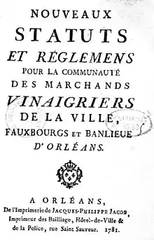 Sous le règne de Louis XVI, une déclaration du roi « portant établissement d'une communauté de marchands fabricants de vinaigre dans la ville d'Orléans » est prononcée au château de Versailles le afin de réglementer la profession des vinaigriers[2]. Il y est notamment mentionné dans le premier article que ses près de 300 membres formeront une communauté de marchands-fabricants et débitants de vinaigre qui jouira du privilège exclusif de fabriquer, vendre et débiter du vinaigre dans la ville et les faubourgs d'Orléans[6].