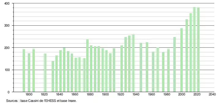 L'évolution du nombre d'habitants est connue à travers les recensements de la population effectués dans la commune depuis 1793. Pour les communes de moins de 10 000 habitants, une enquête de recensement portant sur toute la population est réalisée tous les cinq ans, les populations légales des années intermédiaires étant quant à elles estimées par interpolation ou extrapolation[46]. Pour la commune, le premier recensement exhaustif entrant dans le cadre du nouveau dispositif a été réalisé en 2006[47].