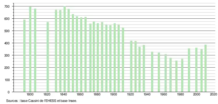 L'évolution du nombre d'habitants est connue à travers les recensements de la population effectués dans la commune depuis 1793. À partir du , les populations légales des communes sont publiées annuellement dans le cadre d'un recensement qui repose désormais sur une collecte d'information annuelle, concernant successivement tous les territoires communaux au cours d'une période de cinq ans. Pour les communes de moins de 10 000 habitants, une enquête de recensement portant sur toute la population est réalisée tous les cinq ans, les populations légales des années intermédiaires étant quant à elles estimées par interpolation ou extrapolation[3]. Pour la commune, le premier recensement exhaustif entrant dans le cadre du nouveau dispositif a été réalisé en 2005[4],[Note 1].
