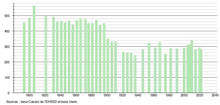 L'évolution du nombre d'habitants est connue à travers les recensements de la population effectués dans la commune depuis 1793. Pour les communes de moins de 10 000 habitants, une enquête de recensement portant sur toute la population est réalisée tous les cinq ans, les populations légales des années intermédiaires étant quant à elles estimées par interpolation ou extrapolation[15]. Pour la commune, le premier recensement exhaustif entrant dans le cadre du nouveau dispositif a été réalisé en 2004[16].