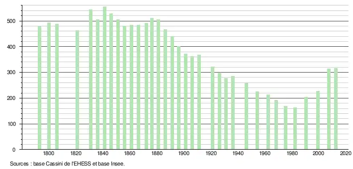 L'évolution du nombre d'habitants est connue à travers les recensements de la population effectués dans la commune depuis 1793. À partir du , les populations légales des communes sont publiées annuellement dans le cadre d'un recensement qui repose désormais sur une collecte d'information annuelle, concernant successivement tous les territoires communaux au cours d'une période de cinq ans. Pour les communes de moins de 10 000 habitants, une enquête de recensement portant sur toute la population est réalisée tous les cinq ans, les populations légales des années intermédiaires étant quant à elles estimées par interpolation ou extrapolation[3]. Pour la commune, le premier recensement exhaustif entrant dans le cadre du nouveau dispositif a été réalisé en 2007[4],[Note 1].