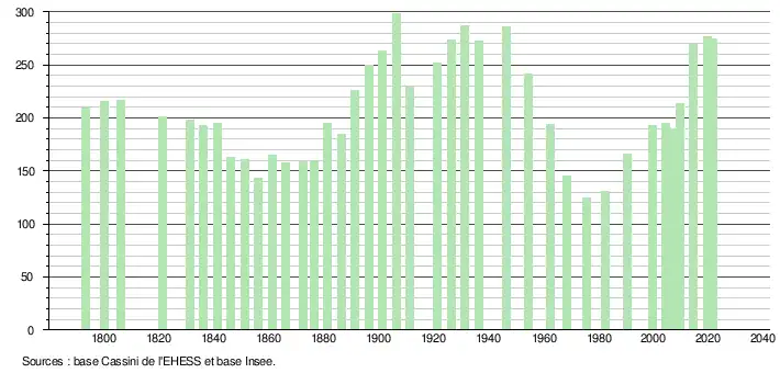 L'évolution du nombre d'habitants est connue à travers les recensements de la population effectués dans la commune depuis 1793. Pour les communes de moins de 10 000 habitants, une enquête de recensement portant sur toute la population est réalisée tous les cinq ans, les populations légales des années intermédiaires étant quant à elles estimées par interpolation ou extrapolation[40]. Pour la commune, le premier recensement exhaustif entrant dans le cadre du nouveau dispositif a été réalisé en 2004[41].