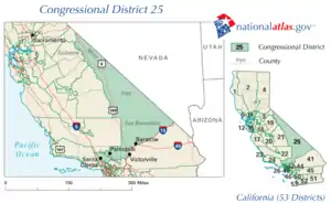 Depuis le redécoupage de 2020, le 25e district congressionnel de Californie est situé dans le désert de Mojave. Il englobe le Comté d'Impérial, la majeure partie du Comté de Riverside et la limite est de San Bernardino. Le district couvre l'intégralité de la frontière Arizona-Californie.