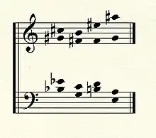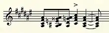 - Thème d'accords, qui se trouve tout au long de l'œuvre, fractionné, concentré, auréolé de résonances, combiné avec lui-même, changé de rythme et de registre, transformé, transmuté de toutes sortes de façons : c'est un complexe de sons destiné à de perpétuelles variations, préexistant dans l'abstrait comme une série, mais bien concret et très aisément reconnaissable par ses couleurs : « un gris bleu d'acier traversé de rouge et d'orangé vif, un violet mauve taché de brun cuir et cerclé de pourpre violacé » selon Messiaen.