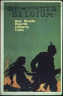 L’historien Kimberly Jensen interprète l’imagerie de la quatrième obligation de guerre de 1918, qui employait une affiche intitulée « Rappelez-vous la Belgique » représentant la silhouette d’une jeune Belge trainée par un soldat allemand sur fond de village incendié, comme : « Ils sont seuls dans la nuit, et le viol semble imminent. Cette affiche montre que les dirigeants ont puisé dans la connaissance et les préconceptions de l’opinion publique américaine sur l’usage du viol par les Allemands pendant l’invasion de la Belgique »[17].