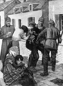 Il existe, dans certains endroits, à Dinant pour la mise à sac de la ville, mais également à Liège, Andenne et Louvain, des preuves de violence préméditée contre les civils[5]:573-4, où l’armée allemande croyait les habitants aussi dangereux que les soldats français eux-mêmes[6],[7]. Par peur des francs-tireurs belges, les troupes allemandes ont incendié des maisons et exécuté des civils dans tout l’est et le centre de la Belgique, y compris à Aarschot (156 morts), Andenne (211 morts), Seilles (383 morts) et Dinant (674 morts)[8]. Des femmes et des enfants figuraient au nombre des victimes[9].