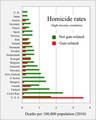 Par rapport aux 22 autres nations à hauts revenus, le taux de meurtres liés aux armes à feu aux États-Unis est 25 fois plus élevé que la moyenne[4]; c'est le pays le plus touché par ce phénomène en matière de morts par arme à feu en temps de paix et en termes de tueries d'enfants en milieu scolaire.