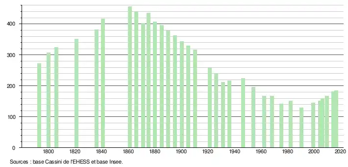 L'évolution du nombre d'habitants est connue à travers les recensements de la population effectués dans la commune depuis 1793. Pour les communes de moins de 10 000 habitants, une enquête de recensement portant sur toute la population est réalisée tous les cinq ans, les populations légales des années intermédiaires étant quant à elles estimées par interpolation ou extrapolation[5]. Pour la commune, le premier recensement exhaustif entrant dans le cadre du nouveau dispositif a été réalisé en 2004[6].
