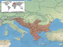 L'espèce se rencontre dans le nord-est de l'Italie, en Autriche en Carinthie et Styrie du sud, dans l'ouest de la Hongrie, en Slovénie, en Croatie (dont certaines îles de l'Adriatique), en Bosnie-Herzégovine, en Serbie, au Kosovo, au Monténégro, en Albanie, en Macédoine, en Grèce (dont les Cyclades : Paros, Antiparos, Andros, Tinos et l'îlot de Strongylo), en Roumanie, en Bulgarie et en Turquie[1],[2].