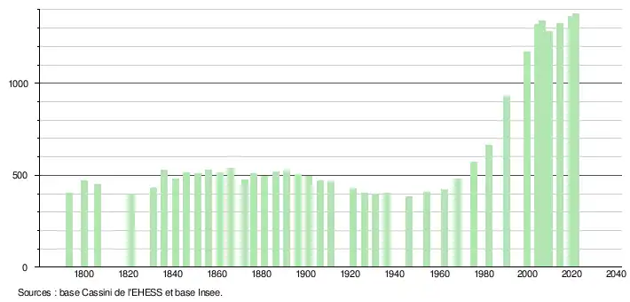 L'évolution du nombre d'habitants est connue à travers les recensements de la population effectués dans la commune depuis 1793. Pour les communes de moins de 10 000 habitants, une enquête de recensement portant sur toute la population est réalisée tous les cinq ans, les populations légales des années intermédiaires étant quant à elles estimées par interpolation ou extrapolation[15]. Pour la commune, le premier recensement exhaustif entrant dans le cadre du nouveau dispositif a été réalisé en 2004[16].