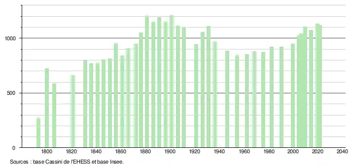 L'évolution du nombre d'habitants est connue à travers les recensements de la population effectués dans la commune depuis 1793. Pour les communes de moins de 10 000 habitants, une enquête de recensement portant sur toute la population est réalisée tous les cinq ans, les populations légales des années intermédiaires étant quant à elles estimées par interpolation ou extrapolation[16]. Pour la commune, le premier recensement exhaustif entrant dans le cadre du nouveau dispositif a été réalisé en 2004[17].