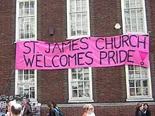 Aux États-Unis, différentes congrégations protestantes bénissent les unions homosexuelles[117] par des cérémonies en tous points semblables au mariage protestant. Les Églises unitariennes-universalistes, Église du courant unitarien-universaliste, bénit des couples du même sexe depuis les années 1970[117],[118]. Le synode général de l'United Church of Christ (UCC, Église unie du Christ, États-Unis) admit officiellement l'ordination d'homosexuels déclarés en 1980[119]. En 1991, ce même synode déclara qu'il « sout[enait] avec audace, célèbr[ait] et s'associ[ait] aux dons des personnes lesbiennes, gais et bisexuelles pour le ministère »[119].