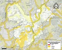 Le retrait-gonflement des sols argileux est susceptible d'engendrer des dommages importants aux bâtiments en cas d’alternance de périodes de sécheresse et de pluie. 26,6 % de la superficie communale est en aléa moyen ou fort (26,8 % au niveau départemental et 48,5 % au niveau national). Sur les 146 bâtiments dénombrés sur la commune en 2019, 18 sont en aléa moyen ou fort, soit 12 %, à comparer aux 36 % au niveau départemental et 54 % au niveau national. Une cartographie de l'exposition du territoire national au retrait gonflement des sols argileux est disponible sur le site du BRGM[17],[Carte 2].